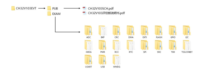 EXAM folder: provides software development drivers and corresponding examples for CH32V103 controller, classified by peripherals